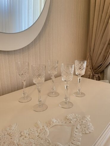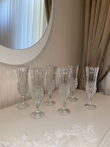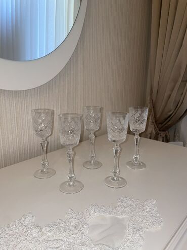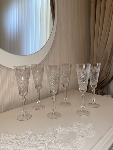 Kristal qədəh dəsti - Sayı: 6 ədəd - Material: şəffaf kristal şüşə - Dizayn: dərin oyma/naxışlı ornamentlər, işıqda parıltını gücləndirən klassik kəsim - Forma: hündür ayaqlı, dar boğazlı qədəhlər...