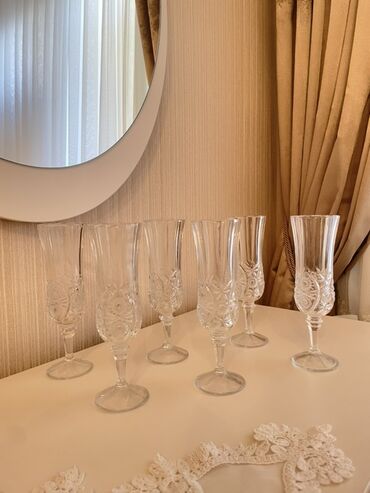 Şampan qədəhləri dəsti – 6 ədəd - Material: şəffaf şüşə - Dizayn: silindrik gövdə, geometrik relyefli (kəsimli) naxış, zərif ayaq və dayaq - Ölçü: hündür, nazik forma (flüt tipli), şampan və qızıl...