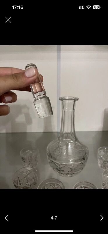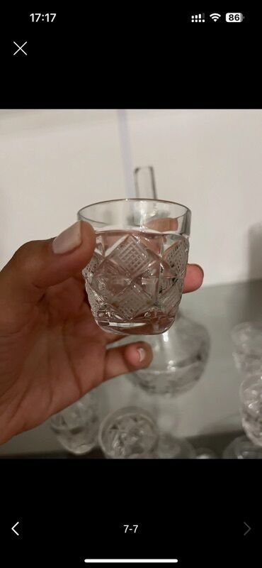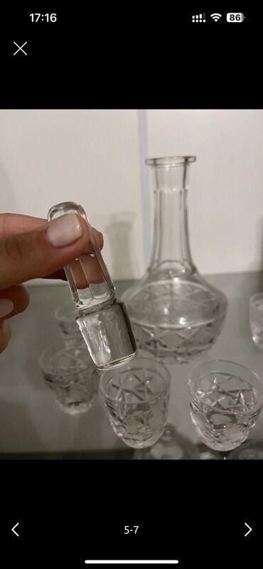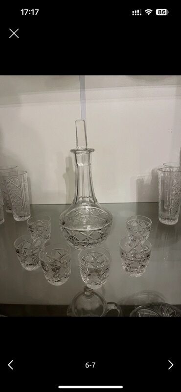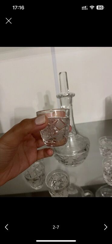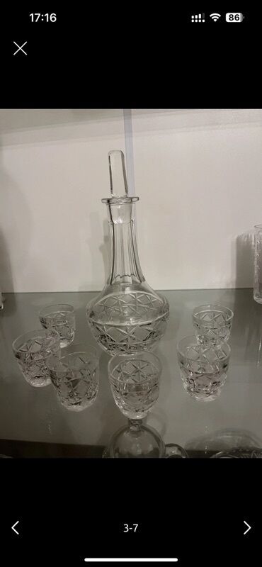 Başqa rəngKristal qrafin dəsti, altı ədəd rumkası ilə birlikdə. Qrafinin uzunsov boynu və geniş aşağı hissəsi var. Stəkanlar da qrafinlə eyni dizaynda, kristal naxışlarla bəzədilib. Həm qonaq qəbulu üçün, həm də dekorativ məqsədlər üçün uyğundur.