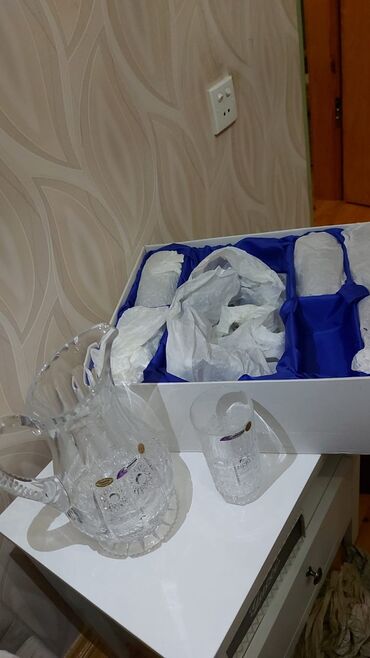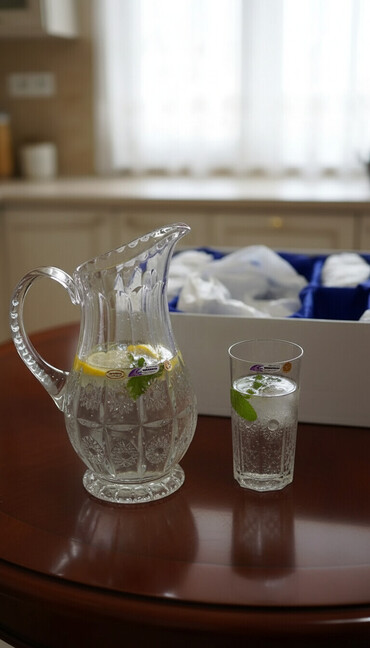 - Dəst tərkibi: 1 qrafin + 6 ədəd su stəkanı (qutuda yerləşdirilmiş)