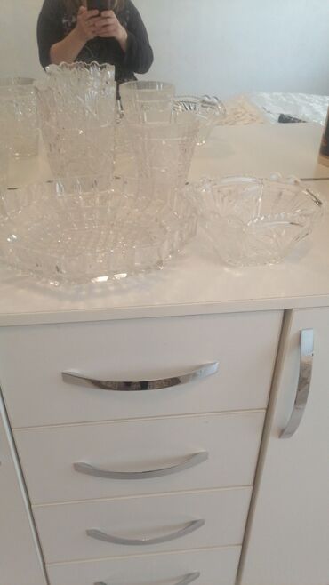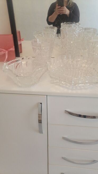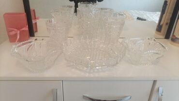 Ayrılıqda qiymətləri: Meyvə qabı - 240 AZN Karzinka - 130 AZN Konfetnica - 100 AZN Qrafinka dəst - 320 AZN Klassik kəsim naxışlı şüşə/qab dəsti - 5 hissədən ibarət dekorativ stolüstü dəst - Hi...