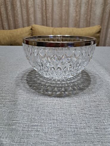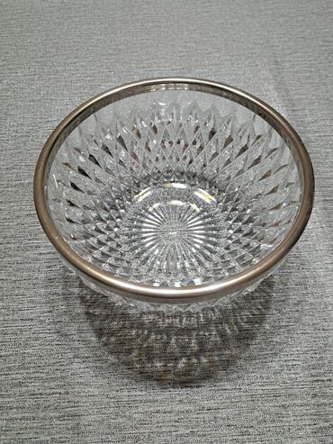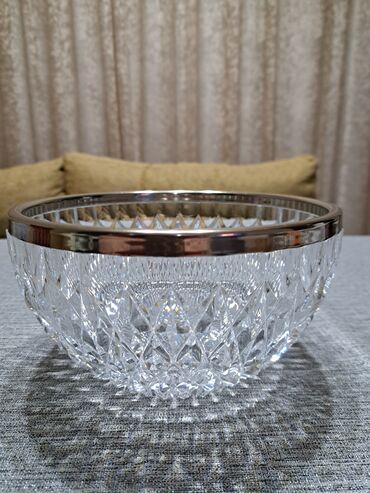 Diametr 26 sm, hündürlüyü 9 sm Billur materialdan hazırlanmış, oyma detalları olan dekorativ qab. Şəffaf görünüşə və dalğalı kənarlara malikdir. Mürəkkəb həndəsi naxışları ilə istənilən masaya zəri...