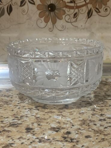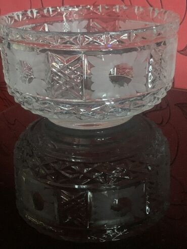 Kəsimli şüşə meyvə qabı - Material: qalın şüşə, əl işi üslubunda dərin kəsim naxışlar (ulduz və romb motifləri) - Forma: dairəvi, hündür kənarlı - Kənarlar: yivli haşiyə, işığı gözəl əks etdirir -...