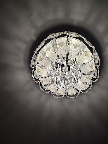 - Dizayn: Şüşə və akril elementli, çoxsaylı fasetli kristal sarkıtlarla zəngin kompozisiya. Ağ-südlü şüşə panellər üzərində qızılı naxışlar və spiral fakturalar. Kənarlarında bəzəkli şəffaf halqalar.