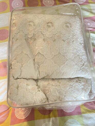 Məhsul: Pərdələr - 3 fərqli Pərdə 1) Ağ rəngdə, üzəri xırda muncuq naxışlı, iki tərəfi boyunca mavi rəngli zərif krujeva haşiyəli geniş yataq örtüyü. 2)Yugoslaviya . Krem tonlarında, üzərind...Giriş•Qeydiyyat
