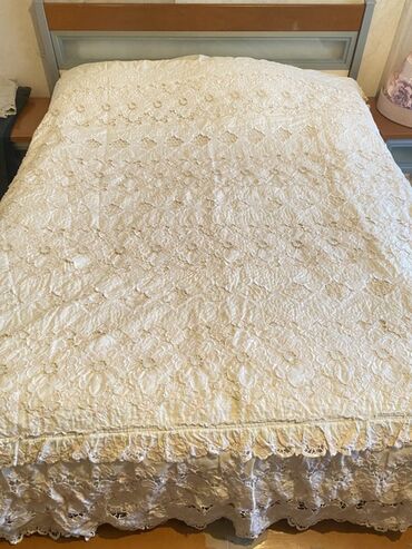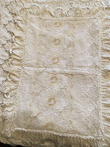 Yenidir Məhsul: Ağ yataq örtüyü - Rəng: Qar kimi ağ - Dizayn: Üzərində zərif çiçək motivli naxışlar və tor işi; kənarlarında büzməli volan və xırda muncuqvari haşiyə - Material: Yüngül, yumşaq par...