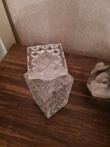 Büllur dekanter - Material: qalın, şəffaf büllur/şüşə - Forma: kvadrat gövdə, kəsikli və relyefli naxışlar; üst hissədə geniş kvadrat qapaq (stopper) - Dizayn: gövdənin ortasında rombvari tekstu...
