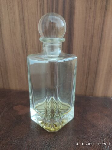 - 1 ədəd altıbucaqlı gövdəli şüşə flakon, altı ulduz kəsimli dib, iri kürəvi tıxaclı.