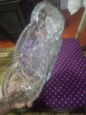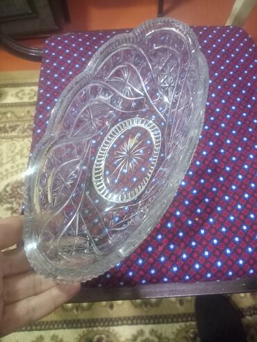 Xrustal Qab - Material: qalın, şəffaf kəsimli xrustal - Forma: oval - Dizayn: bədəni boyunca ulduzvari və tor naxışlı klassik relyef, dibində günəş şüası motivi; kənarları dişli - Ölçü təxmini: u...