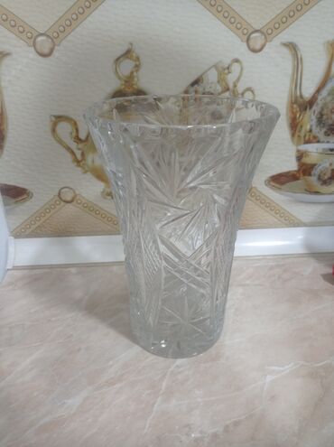 Kristal vaz - Material: qalın kristal şüşə - Dizayn: əl işi görünüşlü dərin kəsmələr, ulduz və həndəsi naxışlar; işığı gözəl şəkildə sınır və parıltı yaradır - Forma: yuxarı hissəsi çiçək ləçəyi k...