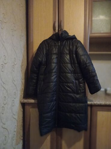 4) Qara kapüşonlu yastı tikişli qışlıq kurtka – dizə yaxın uzunluq, ön tərəfdən fermuarlı, yan ciblər, yüngül şişmə effektli.