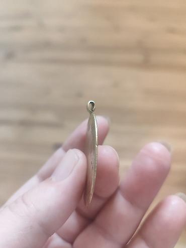 - Material: sarı metal (tunc/bronz tipli), yuxarı hissədə zəncir üçün inteqrə edilmiş halqa