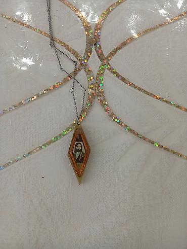 Qızıl rəngli sikkə-askar asmalı kulon - Material: metal qızılı rəngdə (sikkə forması), üst hissədə halqa ilə boyunbağıya taxmaq üçün hazır kulon - Dizayn: bir üzündə sol profildə kişi portreti, kə...