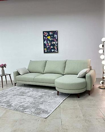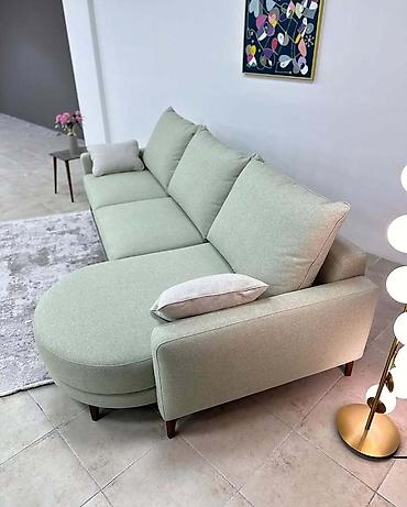 Müasir künc divan – yumşaq nane-yaşıl tonunda, sağ tərəfdə oval formada geniş çarpayı/şezlon hissəsi ilə. Minimalist skandinaviya üslubuna yaxın dizayn, incə xəttlər və taxta konus ayaqlar.