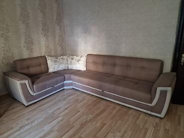Künc divan dəsti - Forma: L-şəkilli künc divan - Rəng və material: Bej-qəhvəyi tonlarda yumşaq parça üzlük - Dəst: 1 böyük üçoturacaqlı hissə + künc modulu + geniş şezlonq; 4 ədəd kvadrat yastıq -...
