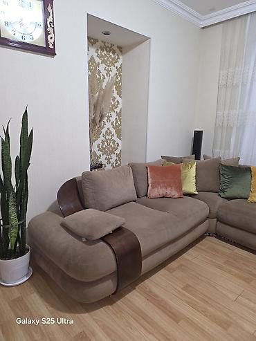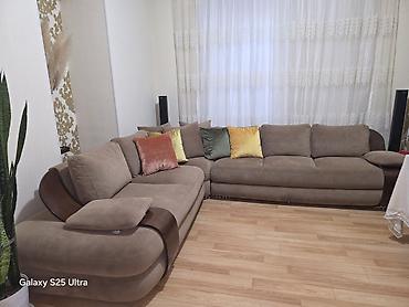 Künc divan dəsti - Forma: L şəkilli künc divan - Ölçü: təxmini 2 hissədən ibarət, geniş oturacaq zonası (kənar qoltuqlu) - Material: yumşaq məxməri/parça döşəmə - Rəng: açıq qəhvəyi/bej tonları - ...