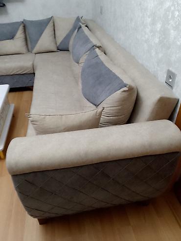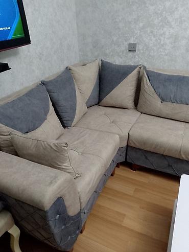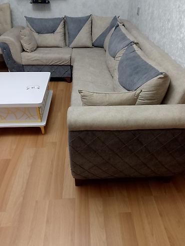 - L şəkilli, 2 tərəfli künc divan: bej və tünd boz tonların kombinasiyası