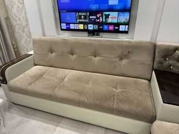 Ölçülər fotolara əsasən genişdir; L forması sağa bucaqlıdır. Divan üzərində TV qarşısında rahat oturma və istirahət üçün idealdır.