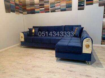 Zərif qızılı elementlər və məxməri faktura interyerə lüks görünüş qatır, metal ayaqlar isə həm möhkəmliyi, həm də yüngül vizual estetikanı təmin edir. Divan geniş oturma sahəsi və künc hissəsi ilə ailə və qonaqlar üçün komfortlu istifadə imkanı verir.