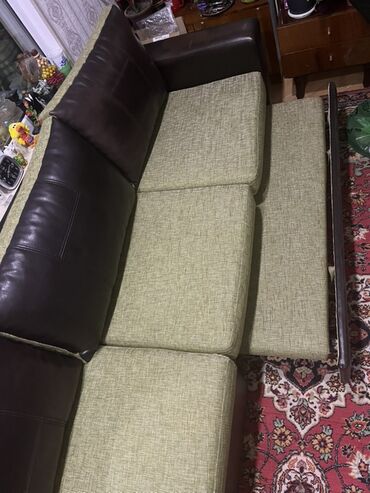 - Rəng və material: tünd qəhvəyi eko‑dəri karkas və arxa yastıqlar, açıq yaşıl rəngli parça oturacaq və yastıq üzləri.