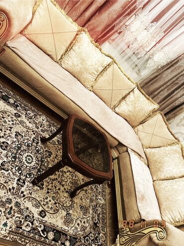 - Klassik üslubda L formalı künc divan: yumşaq bej rəngli parça üzlük, qızılı dekorativ bortlar və oyma elementli taxta baza.