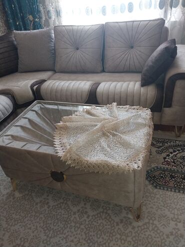 - Zərif bej rəngli künc divan: yumşaq, velvet/nubuk toxumalı parça, dekorativ şaquli-üfüqi tikişlər və düyməli kapitone effektli kürəkliklər.