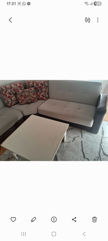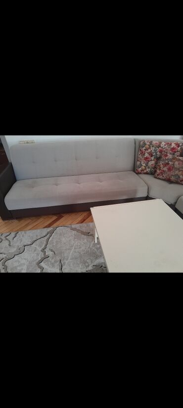 - Həm kitab kimi açılıb 2 nəfərlik geniş yataq olur, həm də hər 2 tərəfin bazası var. - Dizayn: L formalı künc divan, neytral açıq boz rəngli oturacaq və arxa hissə, tünd rəngli yan dayaqlar.