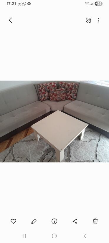 - Ölçü təxmini: 3 nəfərlik uzun hissə + 2 nəfərlik qısa hissə; arada üçbucaq künc element, 3 m x 2 m.