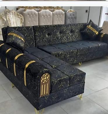 Künc divan – ölçü: 2.5 x 1.5 m - Açılan, bazalı model - Yataq funksiyası var - Qara məxməri üslub, qızılı dekor detallar və qızılı rəngli ayaqlar - Komplektdə dekor yastıqlar - Otağa uyğu...