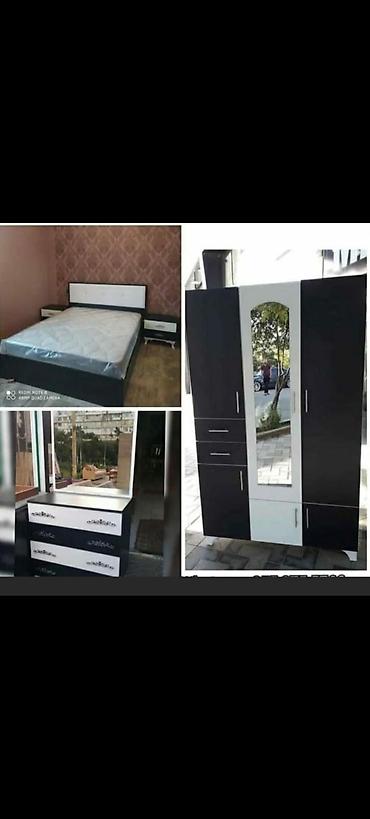- Komplekt: çarpayı, 3 qapılı güzgülü şkaf, tumba(lar), makiyaj masasının güzgüsü ilə