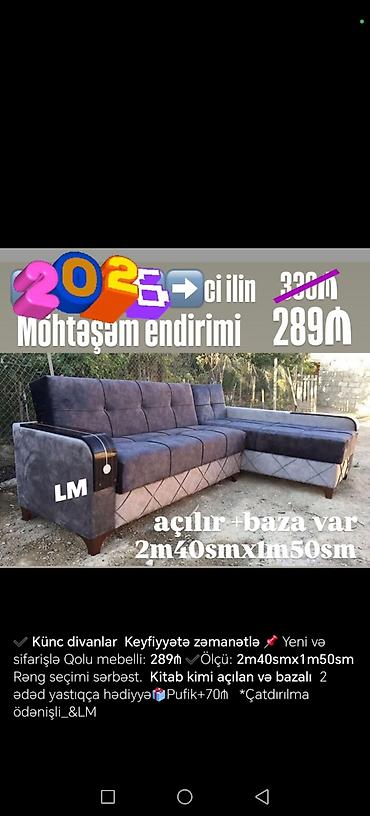 Künc divan – çevrilmə mexanizmi ilə - Forma: L-şəkilli künc divan - Rəng/material: Tünd boz məxmər tipli yumşaq parça, dekorativ kvadrat tikişlər - Oturacaq: 4 iri arxa yastıq, dərin və rahat otur...