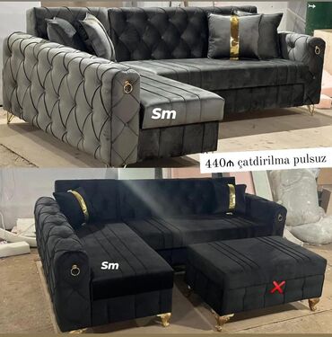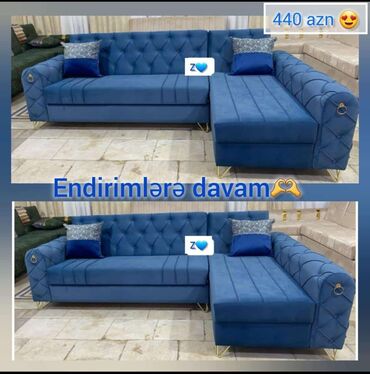 Künc divan – müasir dizayn, yumşaq məxməri parça və romb tikişli yanları ilə. Qızılı halqa dekoru və metal ayaqlar elegant görünüş yaradır. Oturacaq hissəsi genişdir, L formalı quruluş rahat uzanmağa imkan verir. Komplektdə dekorativ yastıqlar var. Rəng seçimləri: boz, qara və mavi. Bəzi modellərdə uyğun puf/oturacaq taburesi mövcuddur.