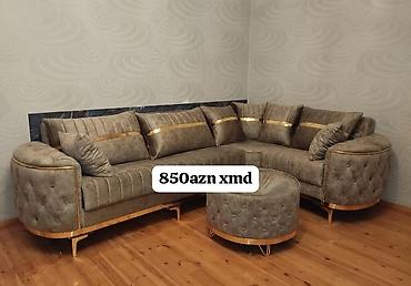 Künc divan dəsti – müasir dizayn, yumşaq parça və qızılı dekor elementləri ilə. Şaquli-sətirli tikişlər, büzməli yan hissələr və metal ayaqlar sayəsində interyerə eleqant görünüş qatır. Komplektə uyğun puf/oturacaq daxildir.