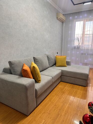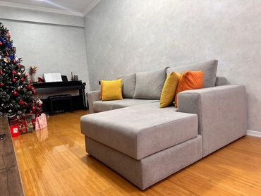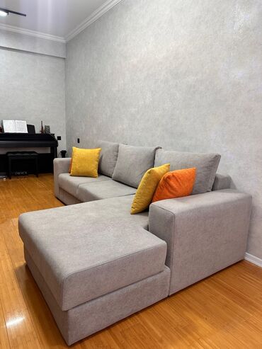 Künc divan – müasir minimal dizayn, sağ tərəfli şezlonqa malik L‑şəkilli quruluş. Yumşaq, toxumalı açıq boz parça üzlük (praktik və rahat), eni geniş qol dayaqları və üç iri söykənəcək yastığı ilə komfortlu oturma təmin edir. Komplektdə sarı və narıncı dekorativ yastıqlar var.