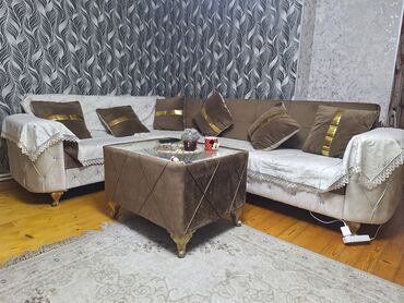 Satılır: Qonaq otağı dəsti - Künc divan: L formalı, klassik naxışlı qızılı-qəhvəyi parça üzlük. Yumşaq oturacaq və kürək hissələri, dairəvi künc keçidi. Komlektdə 4 bəzək yastığı. Aşağı hissə və q...