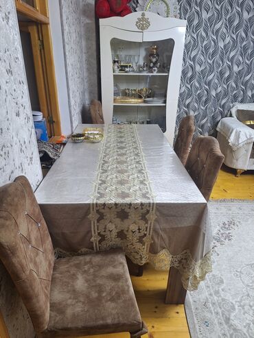- Yemək masası: Dördkünc, taxta ayaqlı, üzərində şəffaf örtü və qızılı naxışlı tül dekorlu süfrə.