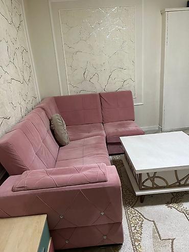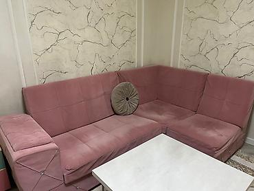 Ölçülər foto əsaslı təxmini: 4-5 nəfərlik oturma imkanı olan kompakt künc forması. Rəng və tekstura otağa zərif görünüş qatır, dekorativ düymələr isə əlavə şıklıq yaradır.