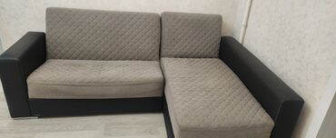 L formalı yumşaq künc divan - Rəng: tünd-bej/boz tonlarında neytral parça, kvadrat tikişli oturacaq və arxa hissə - Ölçü: böyük ölçülü L forması; uzun tərəf geniş oturacaq zonası yaradır, qısa tər...