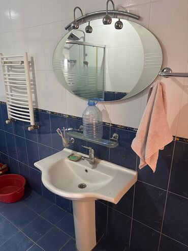 - Güzgü: iri oval forma, üstündə 3 lampalı işıqlandırma, altında şüşə rəf və diş fırçası stəkanı üçün tutacaq.