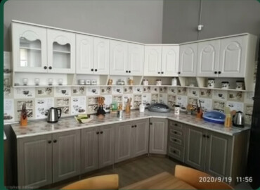 - Avadanlıq üçün yerlər: İş masasının üzərində elektrik qazanı, blender, tost/qril və s. kimi kiçik məişət texnikası üçün geniş sahə; divar altında açıq kubik rəflər ədviyyat, fincan və qablar üçün