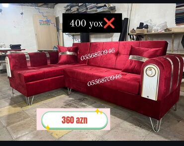 - Künc divan (qırmızı): Parlaq məxmər üslublu parça, metallik dekor və nazik metal ayaqlar. Qiymət: 360 AZN (şəkildə göstərilib).