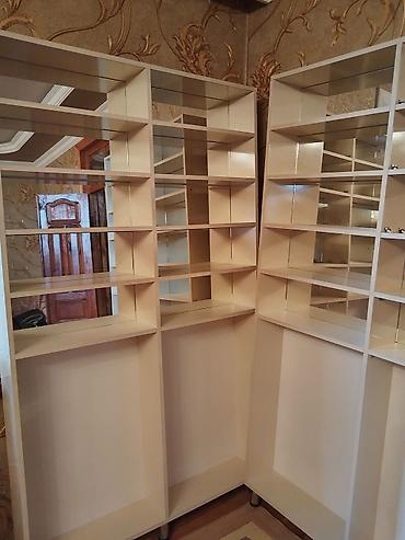 - Konstruksiya: iki moduldan ibarət künc birləşməsi; hər modulda çoxsaylı üfüqi rəflər və aşağı hissədə hündür bölmələr