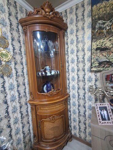 Künc vitrin şkafı – klassik üslubda, oymalı dekor və qızılı naxışlarla. - Material: təbii ağac görünüşlü korpus, şüşə qapılı üst hissə - Forma: künc yerləşdirmə üçün üçbucaq planlı, yuxarıdan taq...