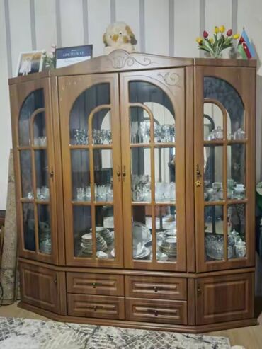Künc vitrini – taxta karkaslı, şüşə qapılı geniş servis dolabı.