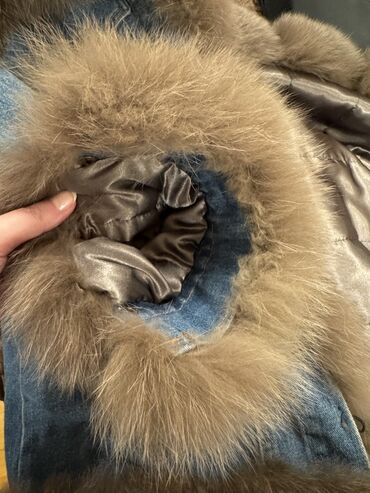 Denim parka tipli üst geyim: - Açıq-mavi cins materialdan hazırlanıb - Geniş, həcmli süni kürk görünüşlü (ağ-qara uclu) kapuşon - İçi yumşaq, tüklü astarlıdır – isti saxlayır - Ön hissə gizli fermu...