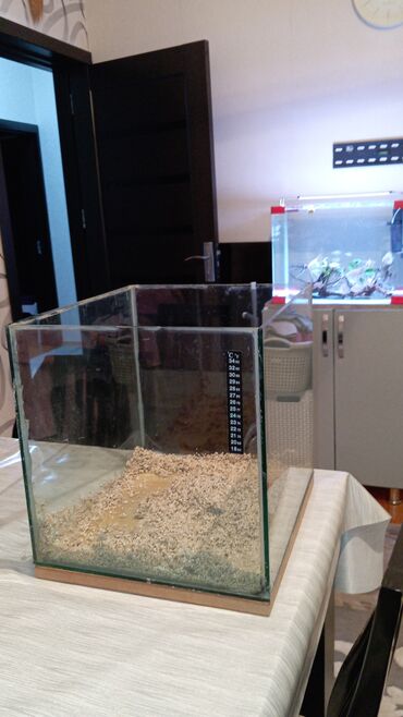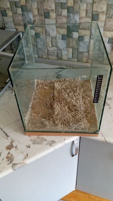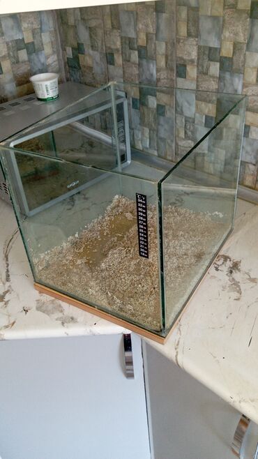 İstifadə olunub cəmi 1 ay. Böyük akvarium aldığım üçün bu akvarium artıq lazım deyil. Çox keyfiyyətli hazırlanıb. Ölçüləri 40 × 25 × 30 sm-dir. Həcmi təxminən 40 litrdən bir az çoxdur.Fon iki tərəf...