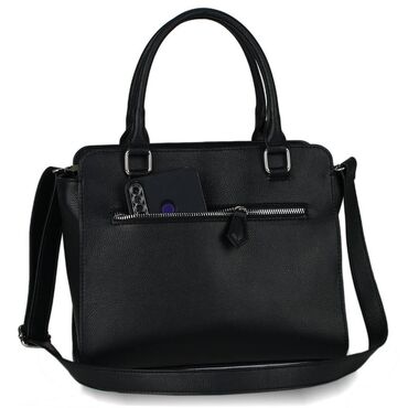 Qadın əl çantası – klassik qara rəngdə, sərt formalı. Üstündə böyük dekorativ bant və kiçik asqı bəzəyi var. - Çevik daşıma üçün tənzimlənən, çıxarıla bilən uzun kəmər - Üstdə rahat tutacaq - Ön t...