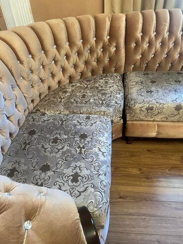 - Yumşaq məxməri bej rəngli üzlük, kapitone tikişlər və dekorativ kristal düymələrlə zərif görünüş