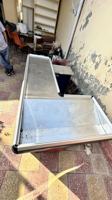 Kassası stolu market üçün – L formalı, metal-korpuslu yaxşı vəziyyətdədir. Çox az istifadə olunub. Ölçüləri: eni sol tərəf:1.20sm, sağ tərəf: 60sm, uzunluğu:1.90 sm