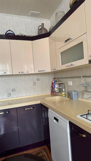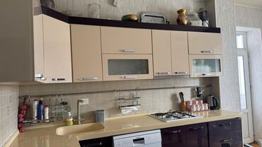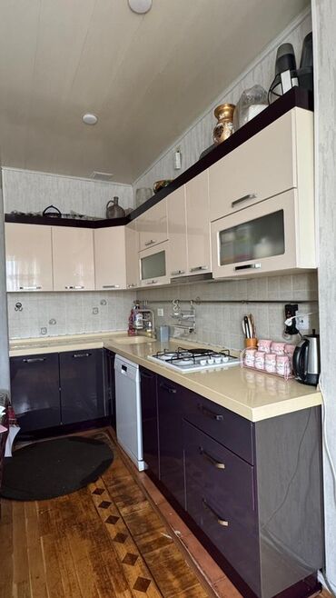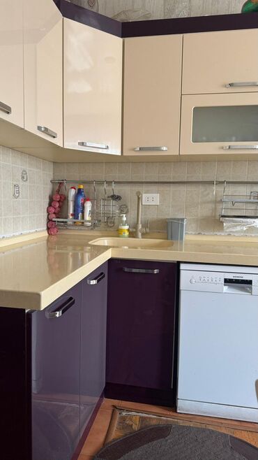 Mətbəx mebeli dəsti – L formalı, krem və tünd bənövşəyi rəng kombinində, parlaq (high-gloss) fasadlarla.